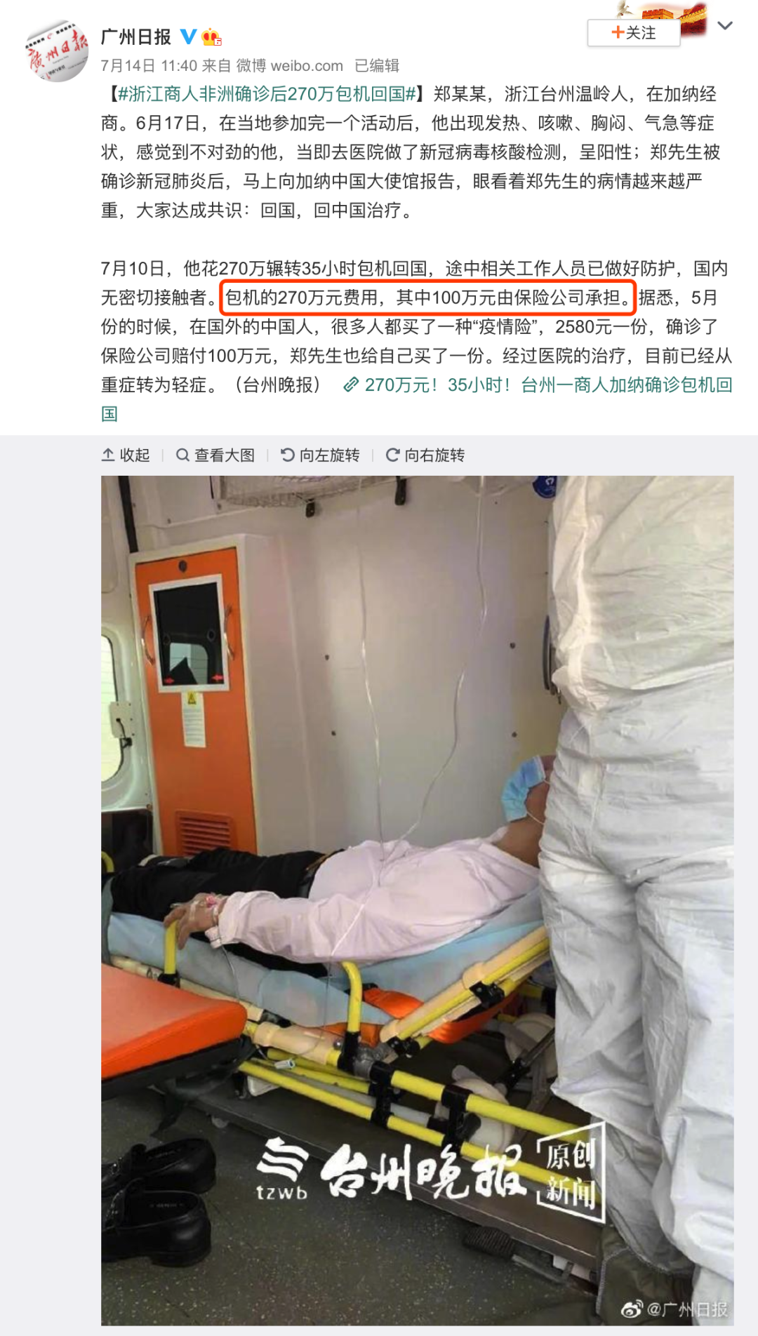 自从疫情发生以来,关于新冠肺炎的治疗费用备受关注,上周媒体上报道了浙江台州在非洲打拼的商人郑先生在海外感染新冠肺炎之后最后选择包机回国治疗。包机整体花费270万,保险公司承担了100万。