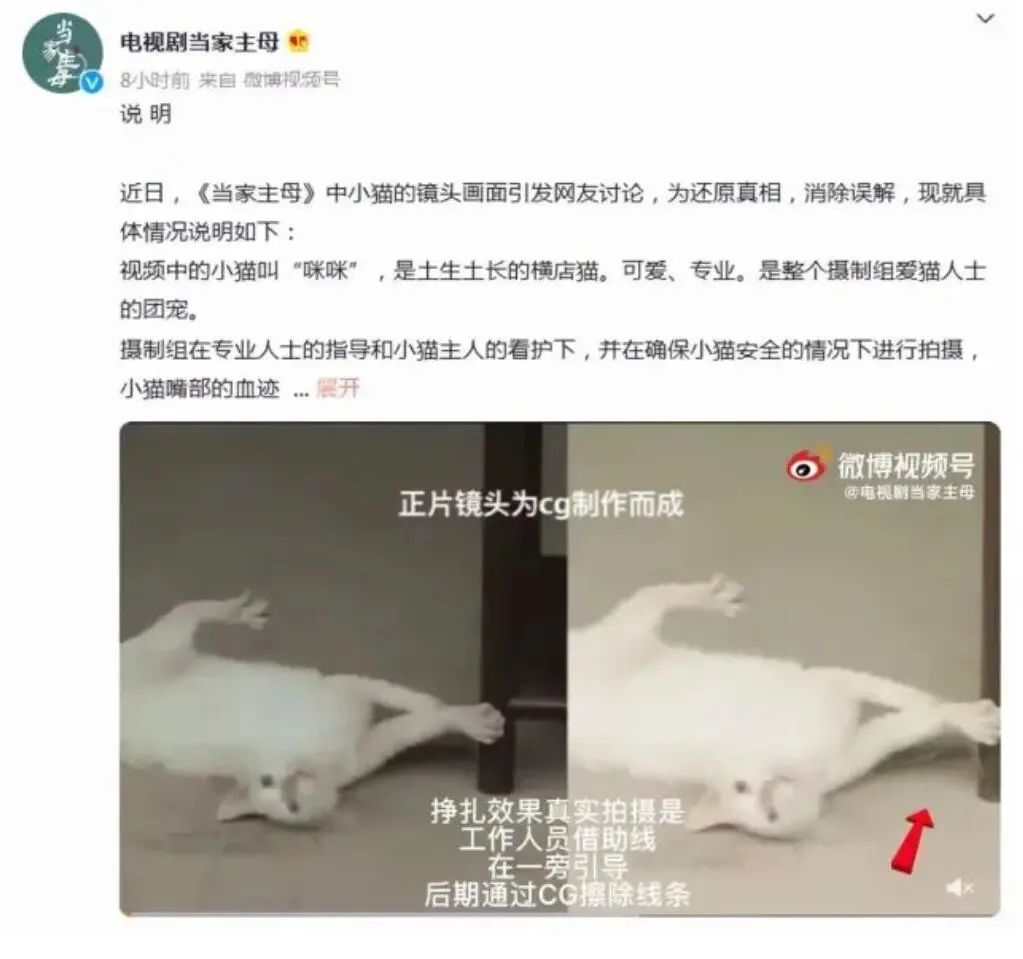 最近《当家主母》这部剧被网友们推上了风口浪尖,并不是因为电视剧的内容精彩,而是在第32集中有一个非常有争议的镜头。镜头中,猫咪因为被毒死而僵硬地摔下桌、口吐鲜血。