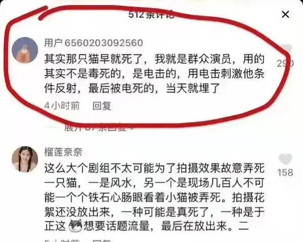 但有自称是《当家主母》剧中群演的网友,在网络上一段热播的视频底下留言称,之前受质疑被毒死的猫,实际上已经被电死。此话一出,再次将《当家主母》剧组推至风口浪尖。