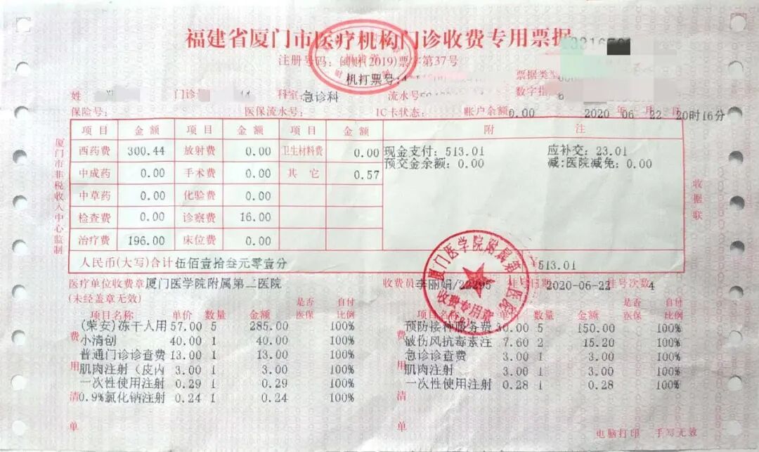救治:厦门医学院附属第二医院。客户按医疗材料要求提供了:病例及发票,最终理赔金额:413.01元=513.01(发票金额)-100(免赔额)元。