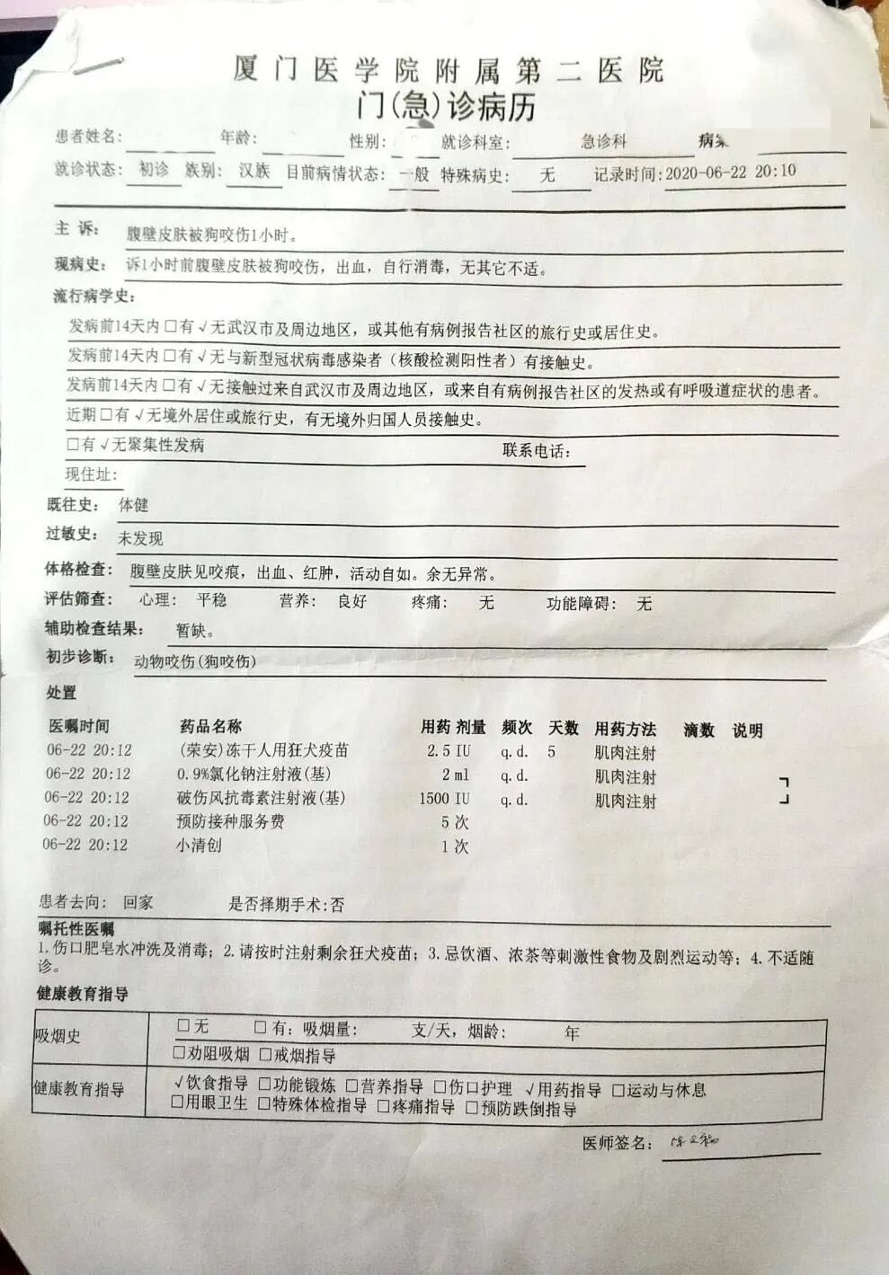2020/6/22 20:46在厦门市集美区浔江路路边走,路遇恶犬遭追赶扑咬,已及时送到医院处理伤口接种狂犬疫苗。