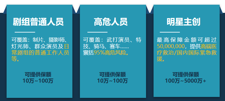 特技人员险可覆盖:爆破人员、武打演员、特技、骑马、赛车等高危拍摄,囊括95%的高危风险。更能为剧组人员的安全提供保障。一旦有意外发生,购买好合适的保险也可以给到专业人员最可靠的保障。