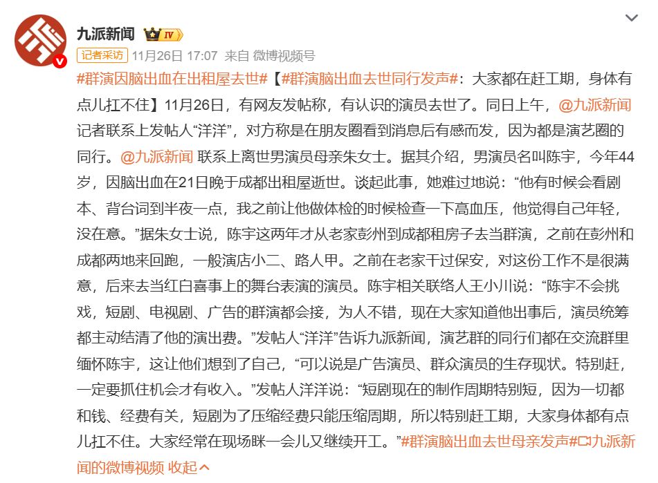 近日,#群演因脑出血在出租屋去世#的词条登上热搜。据悉,11月21日晚,群演陈宇在成都出租屋突发脑出血去世。其母朱女士透露,陈宇常熬夜背台词至凌晨一点,此前曾拒绝高血压检查建议,自认“年轻扛得住”。