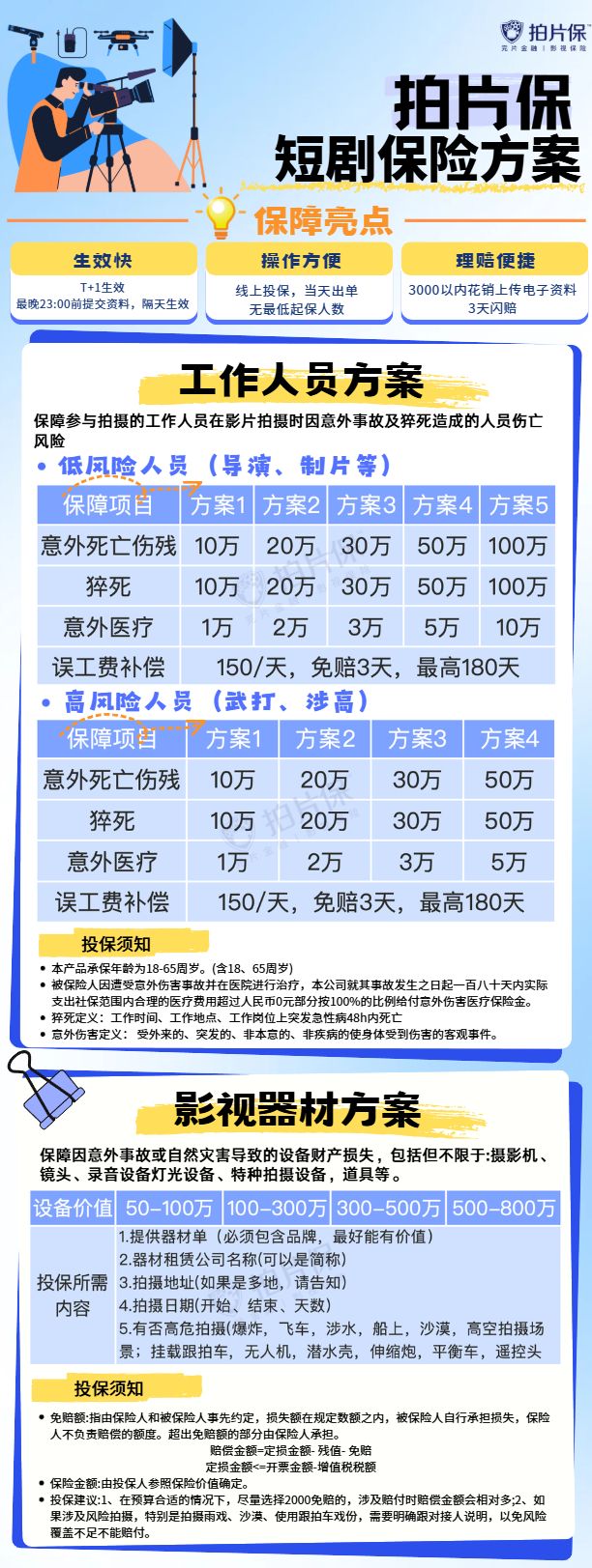 虽然现在拍片保的保险方案基本都涵盖了因工猝死,但根据现有案例来看,很多时候猝死发生在工作结束后的非工作时间段,因此额外扩展【非工作时间猝死】的保险条约也非常重要。同时很多剧组为了省钱只买最基础的、保额最低的保险。这样当意外真的来临时,我们的基础保额根本无法覆盖意外所造成的损失,因此在条件允许的情况下,我们建议大家选择保额更高的方案。
